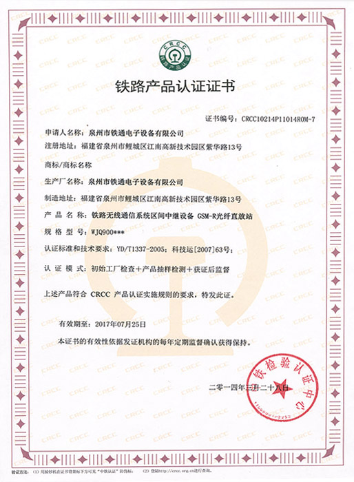 WJQ900型GSM-R光纤直放站具有高线性、低功耗、适应弱场区间多种安装方式、灵活组网等特点。系统具备强大远程和本地网管功能,实现对所有设备实时状态可查可控。远端设备满足交流、远供或太阳能供电方式。产品已取得CRCC铁路产品认证证书。